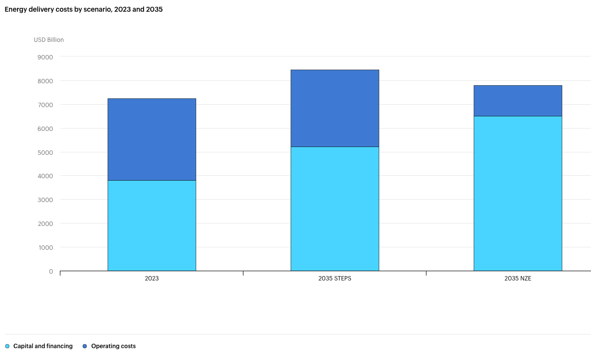 IEAのNZE2050シナリオとSTEPSにおける2035年のエネルギー供給コストを比較した場合、NZE2050シナリオの方がコストが低くなる。化石燃料の購入費用が減少しエネルギー供給に関する運用コストが削減されるためだとした。