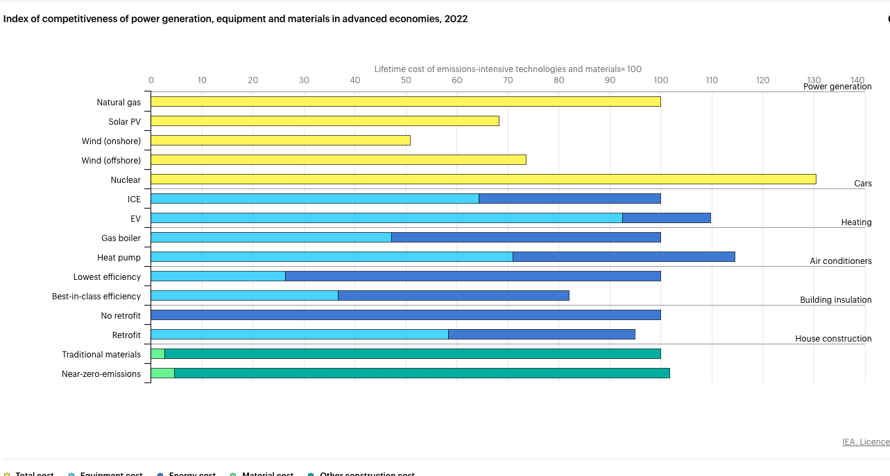 エネルギーや設備別のコスト競争力を比較すると、化石燃料よりも太陽光発電や風力発電のコスト競争力が高い。電気自動車(EV)は内燃機関自動車よりも初期コストが高い場合が多いが、運用コストを節約できるとした。