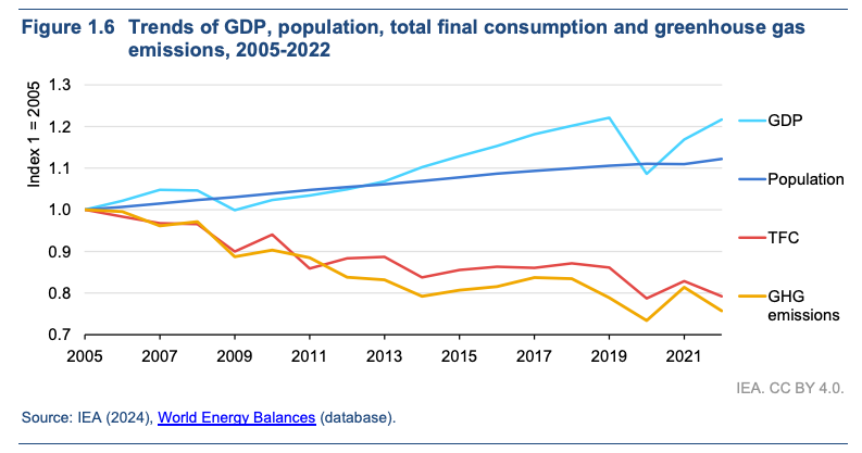 英国のGDPは、2005年以降、成長を続けており、人口も2015年の6,500万人から2022年には6,800万人に増加。一方で、温室効果ガス排出量は減少し続けている。EUと同様に、経済成長と温室効果ガス排出量削減を切り離す「絶対的デカップリング」が実現できている。