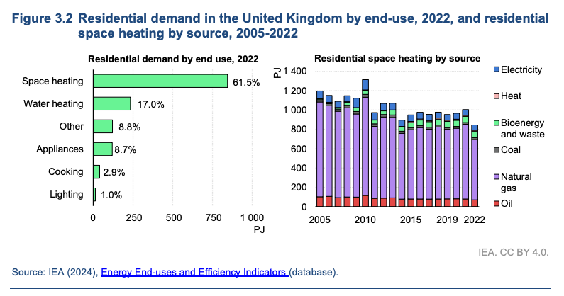 建築セクターでは、既存の建築物のエネルギー効率の向上、化石燃料の暖房システムの電化を優先分野として継続的に対応することを提言。英国の最終エネルギー消費量の29%が住宅部門、12%がオフィスや病院等のサービス部門、合計41%を建築セクターが占めている。住宅部門のエネルギー消費の暖房システムが約62%を占め、そのうち74%を天然ガス、9%を石油で賄っている。