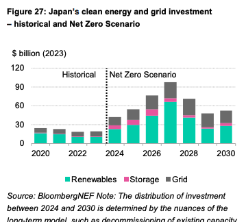 日本政府が掲げる目標もBNEFのネットゼロシナリオよりも低く、原子力発電の再稼働への動きも再生可能エネルギーへの投資を鈍らせているとした。