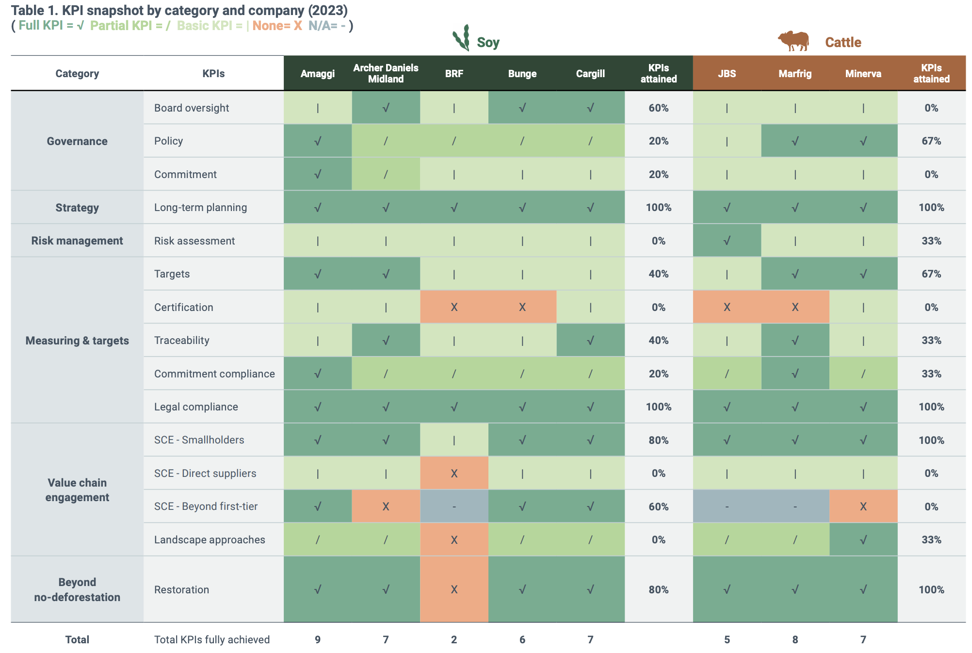 評価対象となった大手8社は、カーギル、アーチャー・ダニエルズ・ミッドランド(ADM)、バンジ、JBS、マルフリグ、アマッジ、BRF、ミネルバ。2020年から2023年のCDP回答を基に分析した。