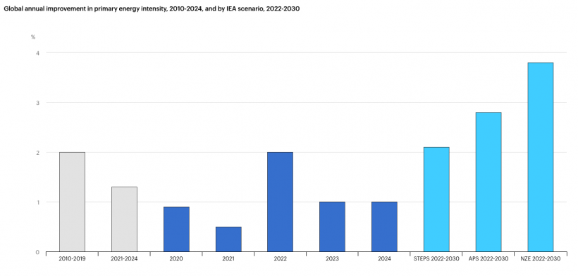 COP28では、年率4%が国際目標となったが、2024年のエネルギー効率の改善率の世界平均は、2023年の結果と同様1%。2022年と、2010年から2019年までの平均は、2%を下回った。