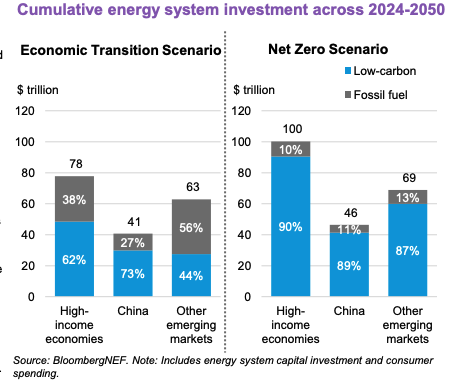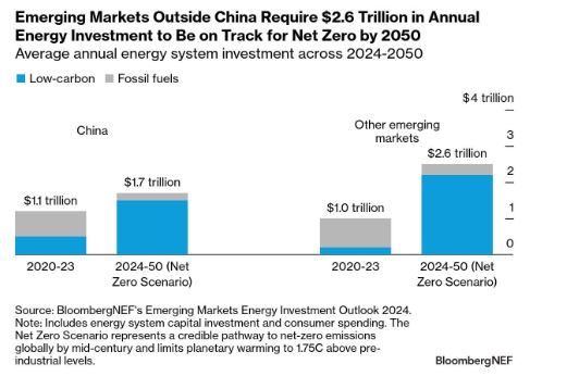 同報告書では、ネットゼロシナリオでは、化石燃料投資よりも低炭素ソリューションへの投資が大幅に増加する必要があることを改めて強調。中国では、2024年から2050年までの投資総額の89%に相当するう年間1.5兆米ドル(約231兆円)を占めることになる。他の新興国市場では、年間投資額の87%に当たる2.2兆米ドル(約340兆円)が必要となるが、現在のシェアは5%しかなくギャップが大きい。