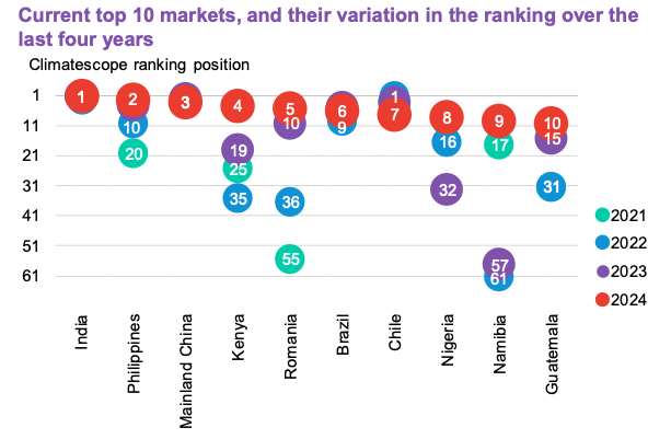2つ目の報告書「Climatescope」は、新興国105カ国のクリーンエネルギー投資に関する魅力の観点から格付けを実施した年次報告書。トップ10は、インド、フィリピン、中国、ケニア、ルーマニア、ブラジル、チリ、ナイジェリア、ナミビア、グアテマラ。トップは2年連続でインド。ケニアは昨年比で15位上昇し5位、ナイジェリアは24位、ナミビアは48位も順位を上げ、トップ10に入った。