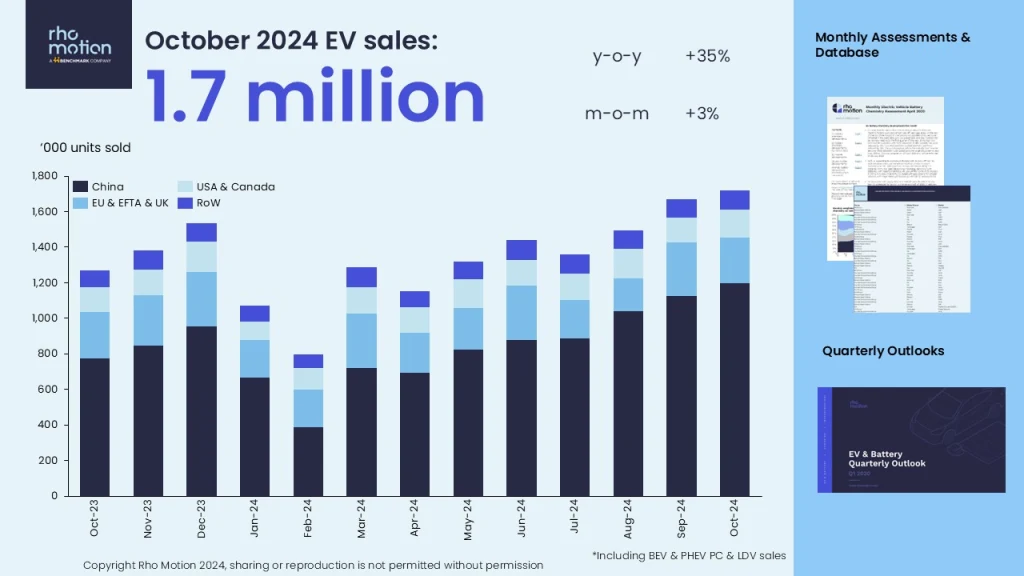 英電気自動車(EV)関連産業調査ロー・モーションは11月13日、10月の世界のEV及びプラグインハイブリッド車(PHV)新車販売台数統計を発表。10月単月で前年比50%増の170万台、1月から10月の累計で前年比24%増の1,330万台となった。