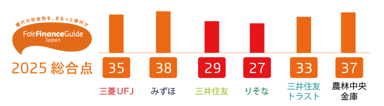 【参照ページ】2025年版ESG方針スコア発表~エクエーター原則を脱退した三井住友がスコア低下、三菱UFJとみずほはネットゼロ目標に逆行