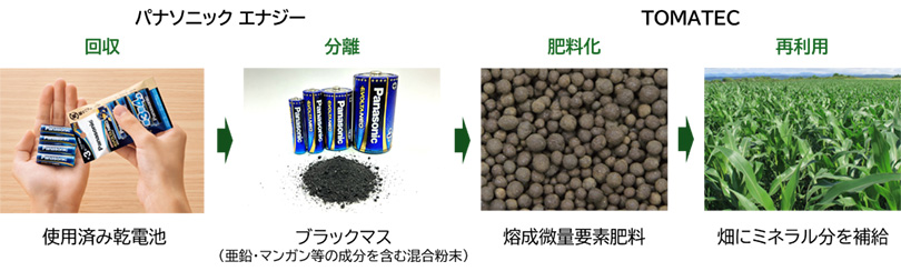 両社は2023年から協議を開始し、実証を重ね2024年9月にパナソニックエナジー製の使用済み乾電池を原料とする熔成微量要素肥料のリサイクルプロセスを確立。リサイクルプロセスでは、パナソニック エナジーが使用済み乾電池からブラックマスを分離し、TOMATECが独自のガラスフリット化技術で、混合粉末を熔成微量要素肥料化する。
