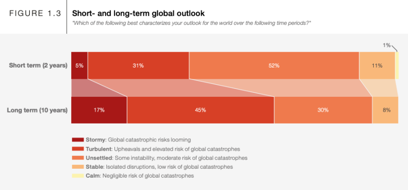 短期的、長期的な世界の展望に関する調査結果では、世界が安定していると回答した割合は短期的には12%、長期的には8%で、昨年の結果より悪化。国際協力の枠組みに対する圧力が増加し、不平等や社会の二極化等の社会的なリスクのランキングが上昇している。