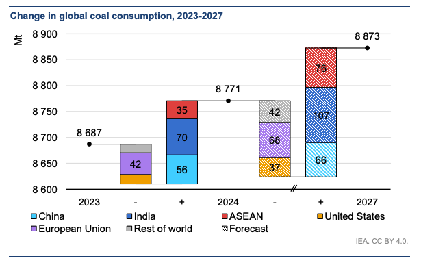 石炭生産量は、石炭需要と同様に2024年に過去最高を記録、2027年まで成長は横ばいだとした。石炭価格は、2017年から2019年平均よりも50%高い状態が続いている。