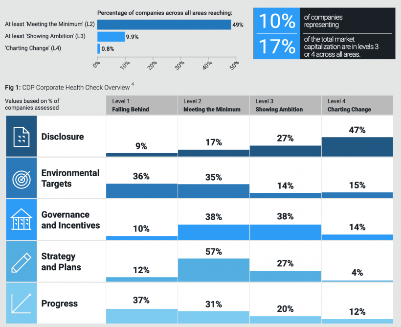 CDPコーポレート・ヘルスチェックは、世界の時価総額の67%をカバーするCDPのデータセットから、2024年の企業開示情報を分析。ビジネスリーダーが変革を推進するために優先すべきアクションを特定し、自社のアクションが市場の同業他社とどのように比較されるかを確認できるよう設計されている。