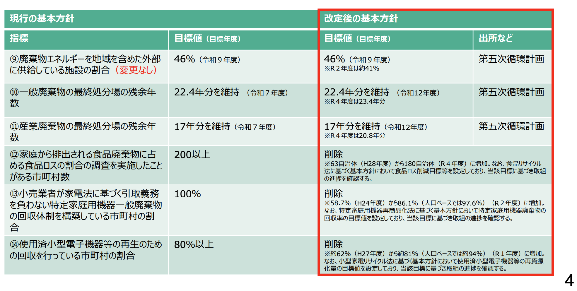 一般廃棄物と産業廃棄物の最終埋立処分場については、残余年数を横ばいで維持。また市町村単位での施策を促進する導入率目標については、一定の水準に達しており、さらに他の政府目標で全体の目標値を設定していることを理由に削除された。