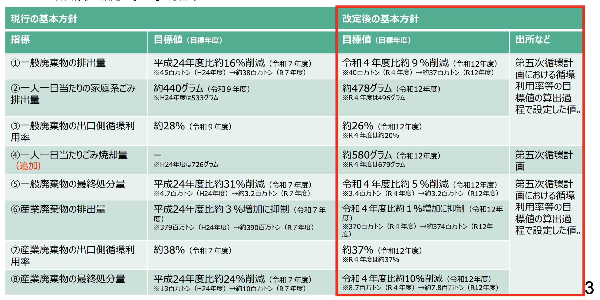 目標値の水準に関しては、一般廃棄物や産業廃棄物の排出量はさらに厳格化していく一方、家庭からの一人当たりの廃棄物量やリサイクル率に関しては目標を実情に合わせて下方修正した。