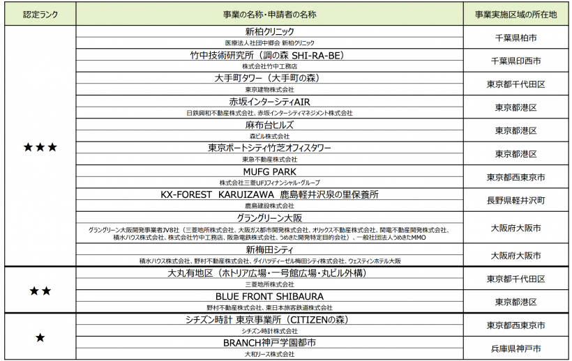 今回の認定では、麻布台ヒルズ、赤坂インターシティAIR、大手町タワー、MUFG Park、グラングリーン大阪、新梅田シティ、シチズン時計東京事業所(CITIZENの森)等が選ばれた。