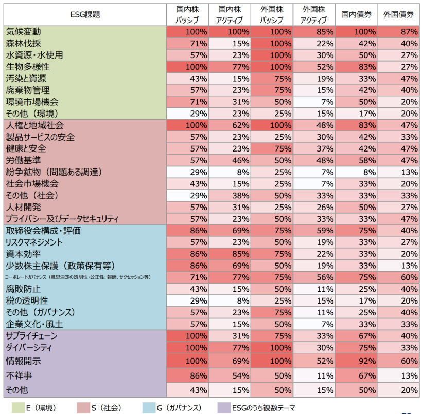 今回の結果では、国内株パッシブ運用機関では、全ての運用会社が「重大」と答えたものが、気候変動、生物多様性、人権と地域社会、サプライチェーン、ダイバーシティ、情報開示の5つ。昨年まで入っていた情報開示が86%へと下がった。