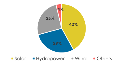 総設備容量の電源種別の比率は、2023年に太陽光発電の設備容量が水力発電の設備容量を抜いた。今回2024年の結果では、太陽光発電がシェアを伸ばし42%で1位、水力発電が29%で2位。風力発電が25%、バイオマス発電、地熱発電、波力発電等を含むその他は4%だった。