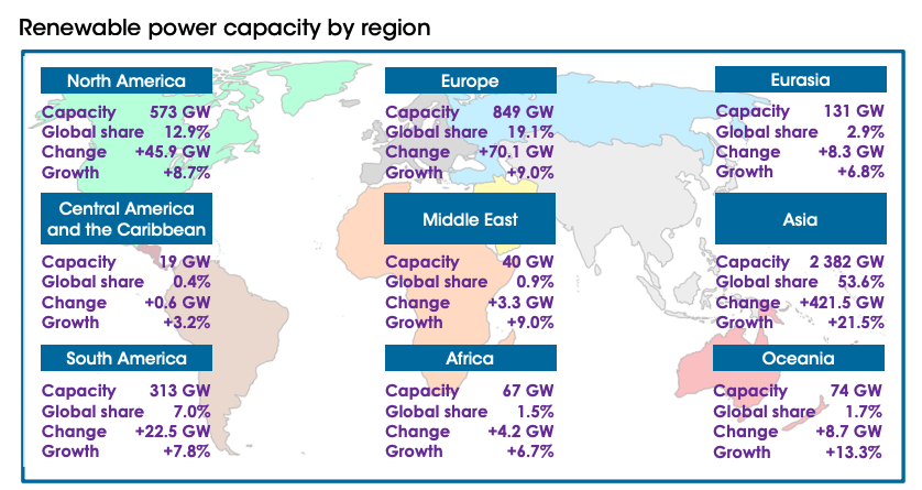 地域別の設備容量の増加では、アジアが421.5GW増で全体の約73%を占めており、そのうち中国が373.6GWを占める。その他の地域では、欧州で70.1GW増、北米45.9GW増、中南米で23.1GW増、オセアニアで8.7GW増、ユーラシアで8.3GW増、中東で3.3GW増、アフリカで4.2GW増。