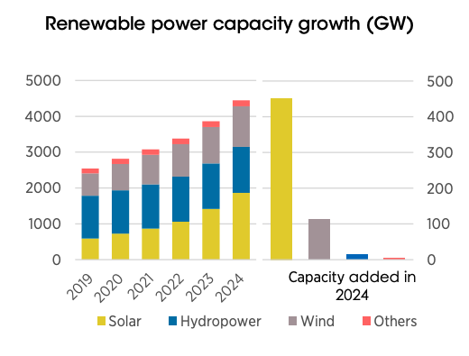 2030年までに再生可能エネルギー設備容量を3倍にするという国連気候変動枠組条約第28回ドバイ締約国会議(COP28)の目標に相当する11.2TWの達成には、年率16.6%の成長が求められる。2024年には過去最大の成長を記録したものの、目標水準には届いていない。