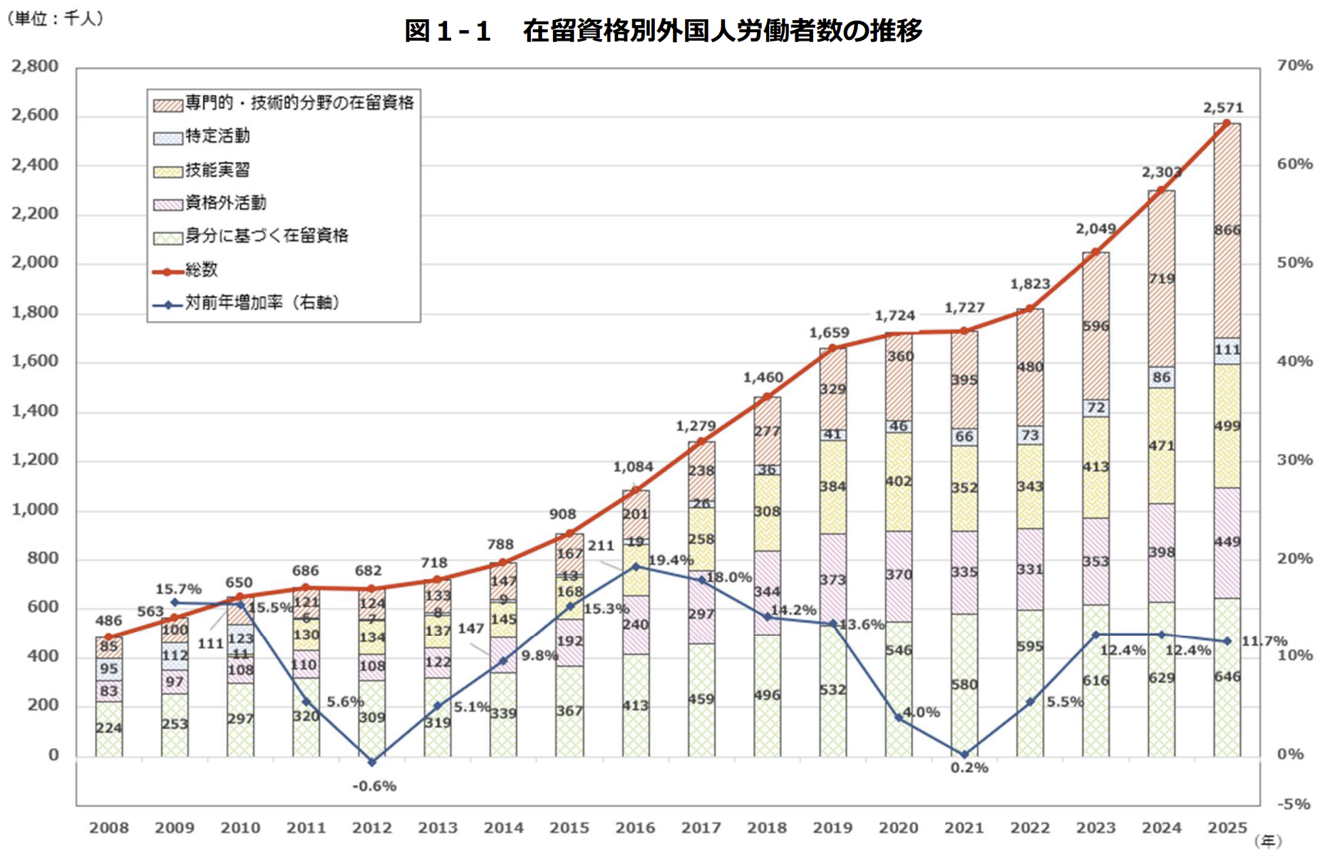 厚生労働省は1月30日、2025年10月末時点の日本国内外国人労働者数を発表。前年比268,450人増加し、2,571,037人となり過去最多を記録。初めて250万人を突破した。同省は毎年1月に、前年10月末時点の外国人雇用統計を公表している。
