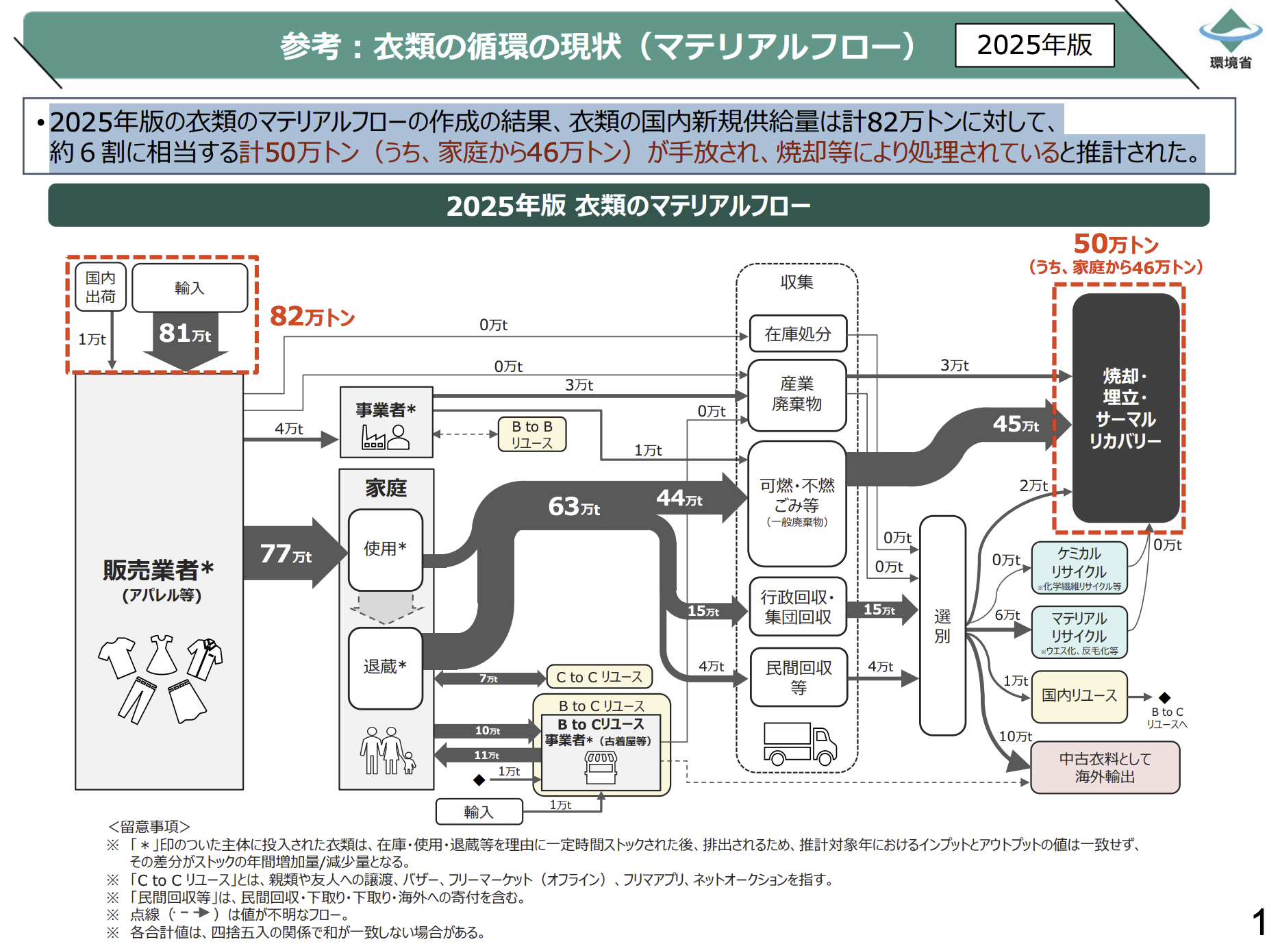 現在日本では、衣類の国内新規供給量が計82万tなのに対し、約6割に相当する計50万t(そのうち家庭から46万t)が手放され、焼却等により処理されている。