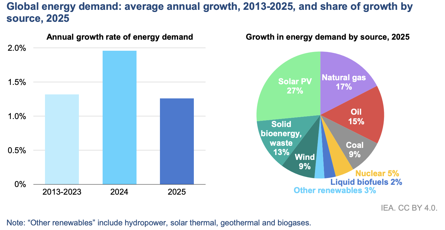 2025年の世界のエネルギー需要は前年比1.3%増で、前年の2%を下回った。背景には、経済成長のやや鈍化に加え、エネルギー集約型産業の成長率の減速、冷房需要の減少、省エネ改善がある。それでも、エネルギー生産は、全てのエネルギー源で増加し、とりわけ太陽光発電が需要増加分の4分の1以上を担い、最大の寄与となった。天然ガスや石油、石炭も引き続き増加したが、その伸びは限定的で、ゼロエミッション電源(再生可能エネルギーや原子力)が需要増の約6割を支えた。 (出所)IEA